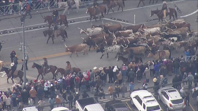 Dozens of Longhorn cattle made their way along the streets of downtown Denver to kick off the National Western Stock Show Parade on Thursday afternoon.