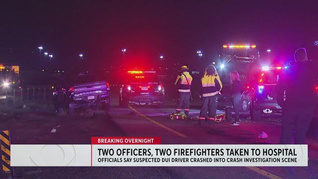 Two police officers and two firefighters were taken to the hospital Thursday night after a suspected DUI driver crashed into the scene of a crash investigation.