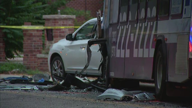 A woman who was driving an SUV has died and what's believed to be her baby was injured when that SUV crashed into an RTD bus in Aurora on Thursday evening.