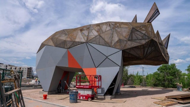 The art installation resembles a giant rhinoceros.