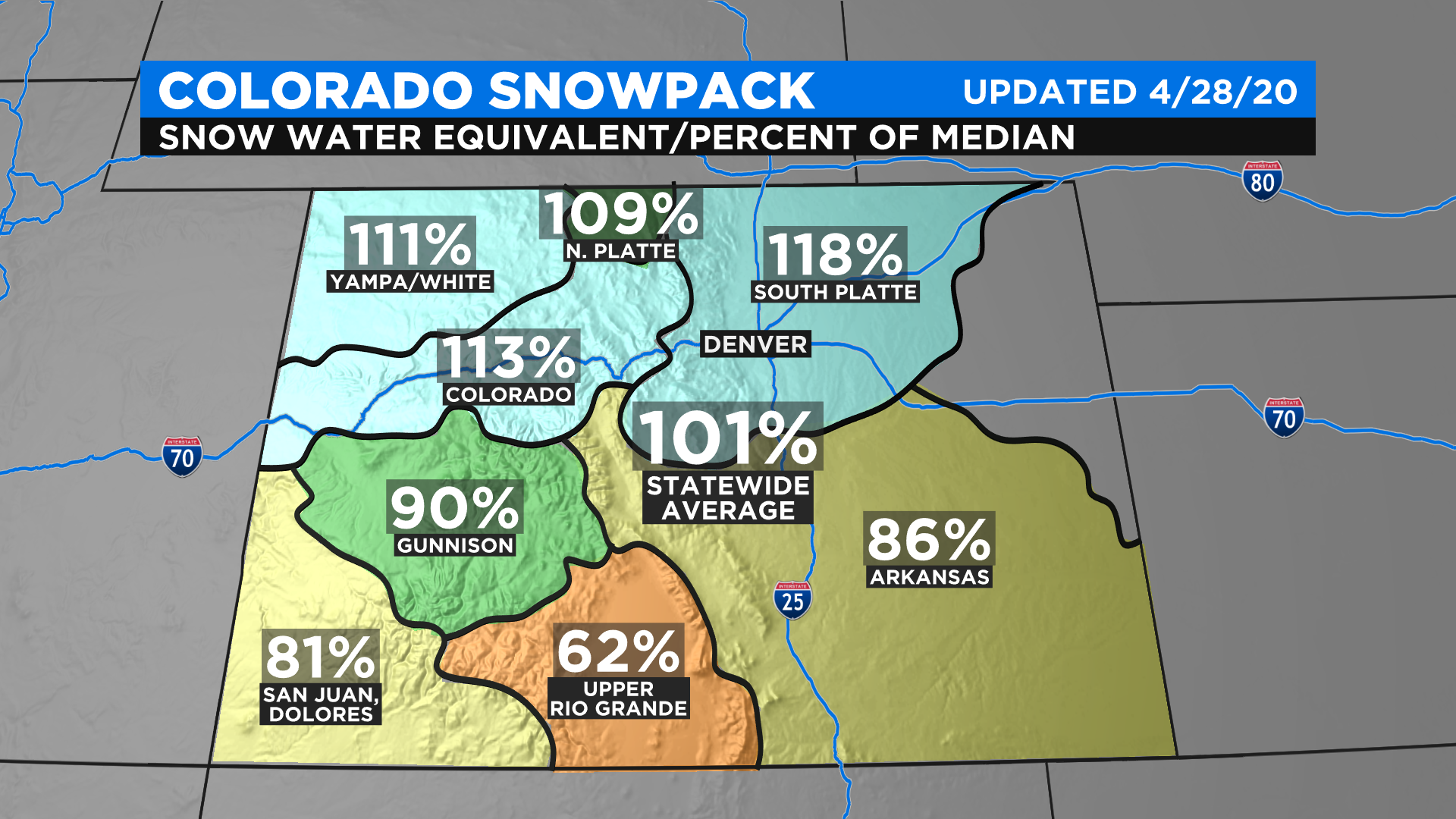 Snowpack remains at or above normal for about half the river basins in Colorado. As of Tuesday afternoon, the statewide average with snowpack was 101% but the South Platte basin which includes the entire Denver metro area was 118% of normal.
