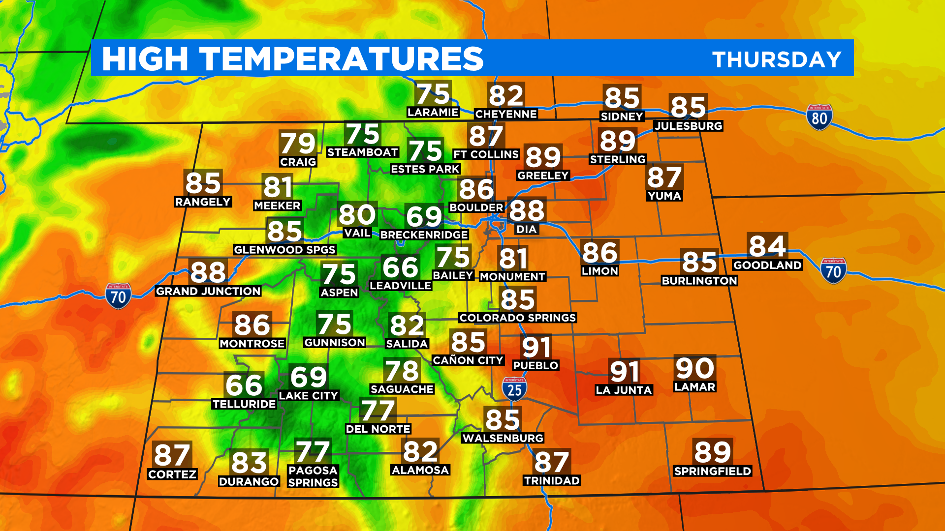 The warmest (or hottest!) weather will be on Thursday afternoon when the Denver, Boulder, and Fort Collins areas should reach the upper 80s. The record in Denver is 90 degrees set on April 30, 1992. For now that record appears safe.