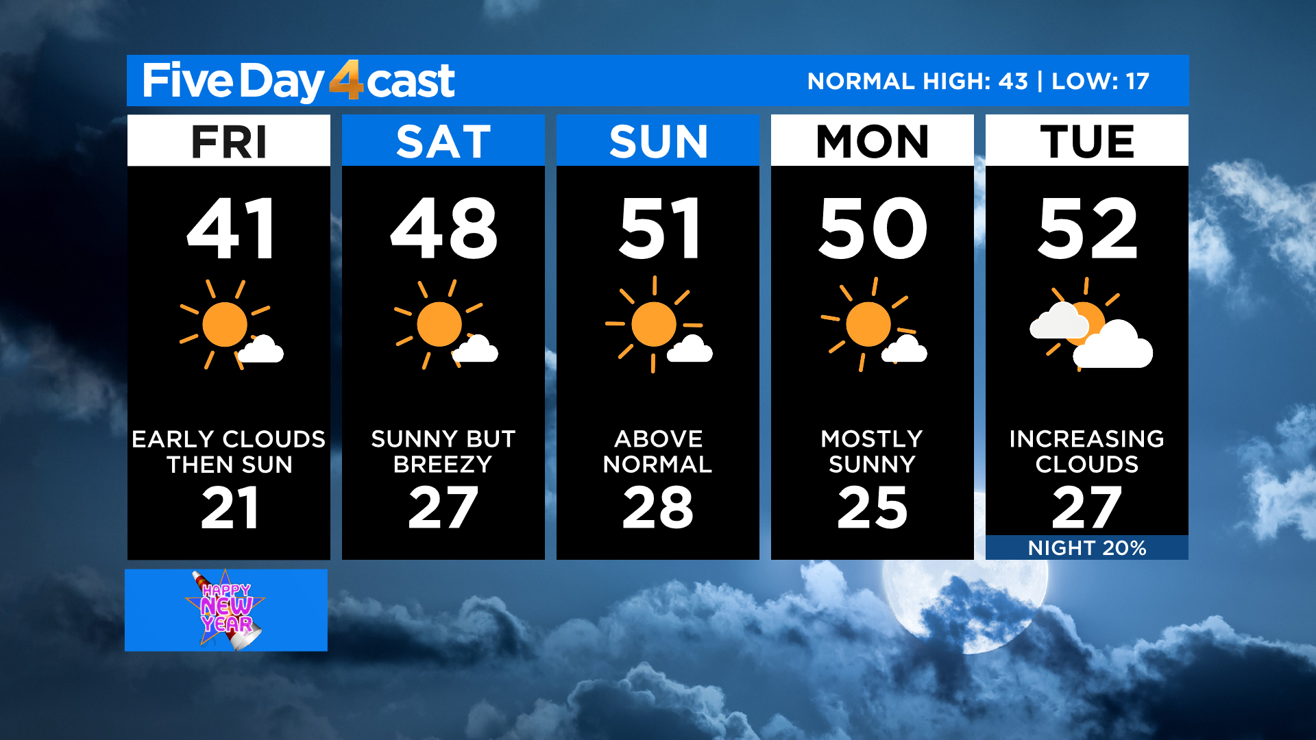 DENVER (CBS4) - We'll have a quiet weather pattern around Colorado to kick off the new year this weekend. It will be dry today statewide with the only exception being a few light snow showers possible along the Continental Divide. We'll see some occasional cloud cover, especially in the morning and early afternoon.