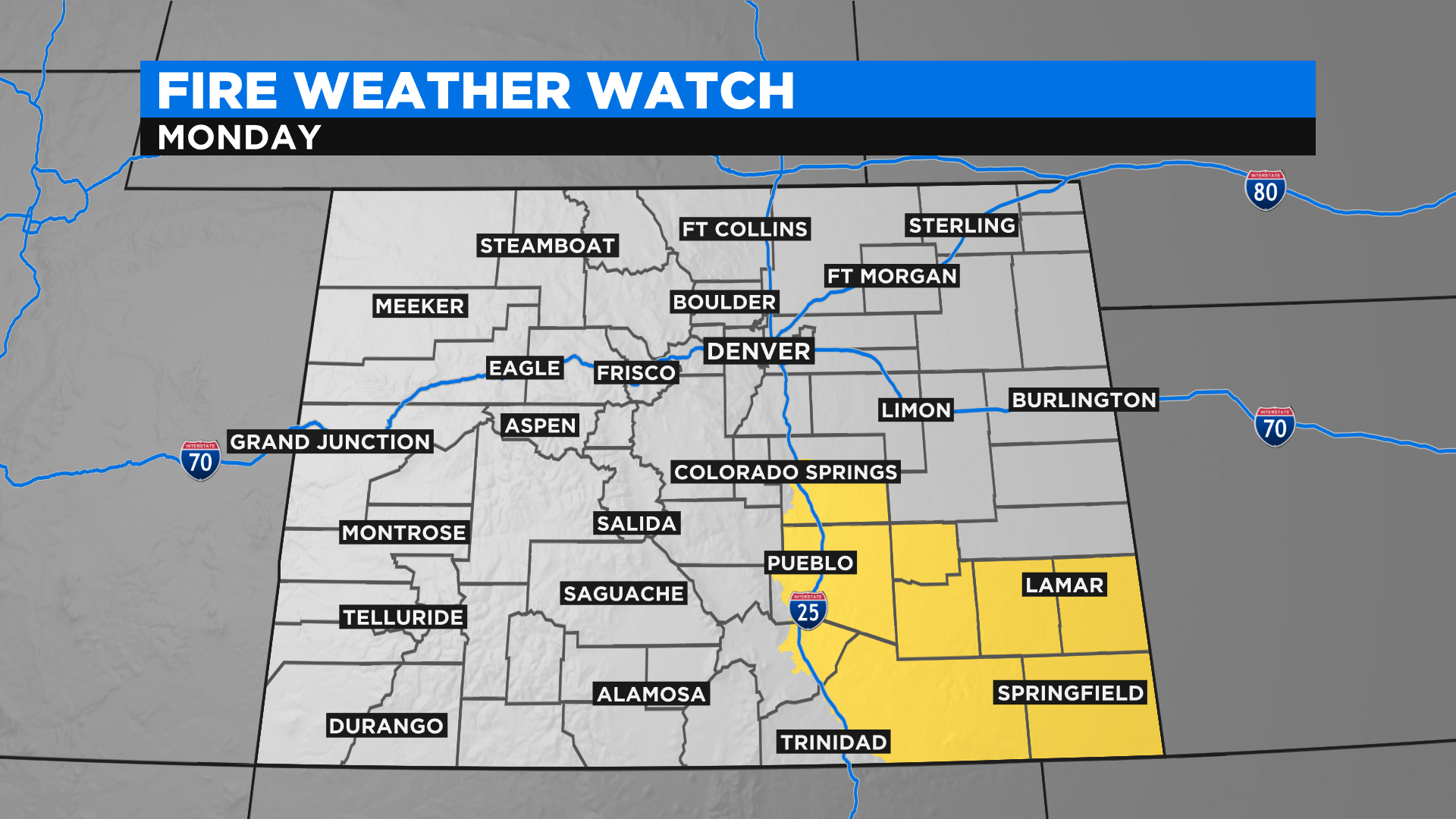 The National Weather Service has issued a Fire Weather Watch for all of southeast Colorado on Monday. This could be upgraded to a Red Flag Warning later today. We could also see the fire weather alerts expand into other areas over the next few days.