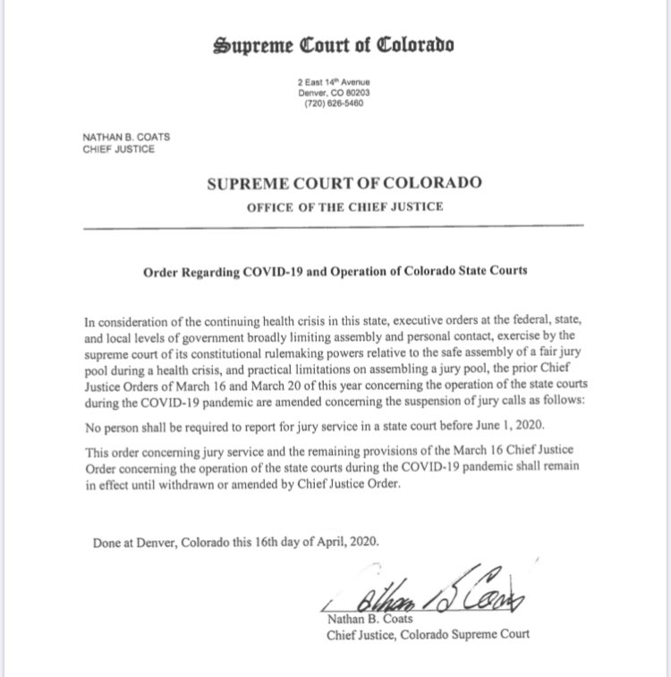 Coronavirus Pandemic: No Jury Trials In Colorado Courts Until June 1