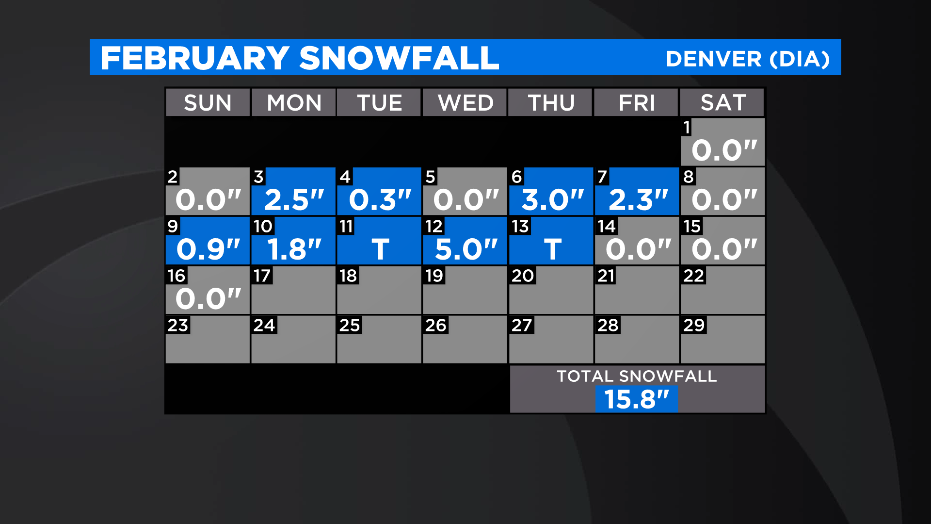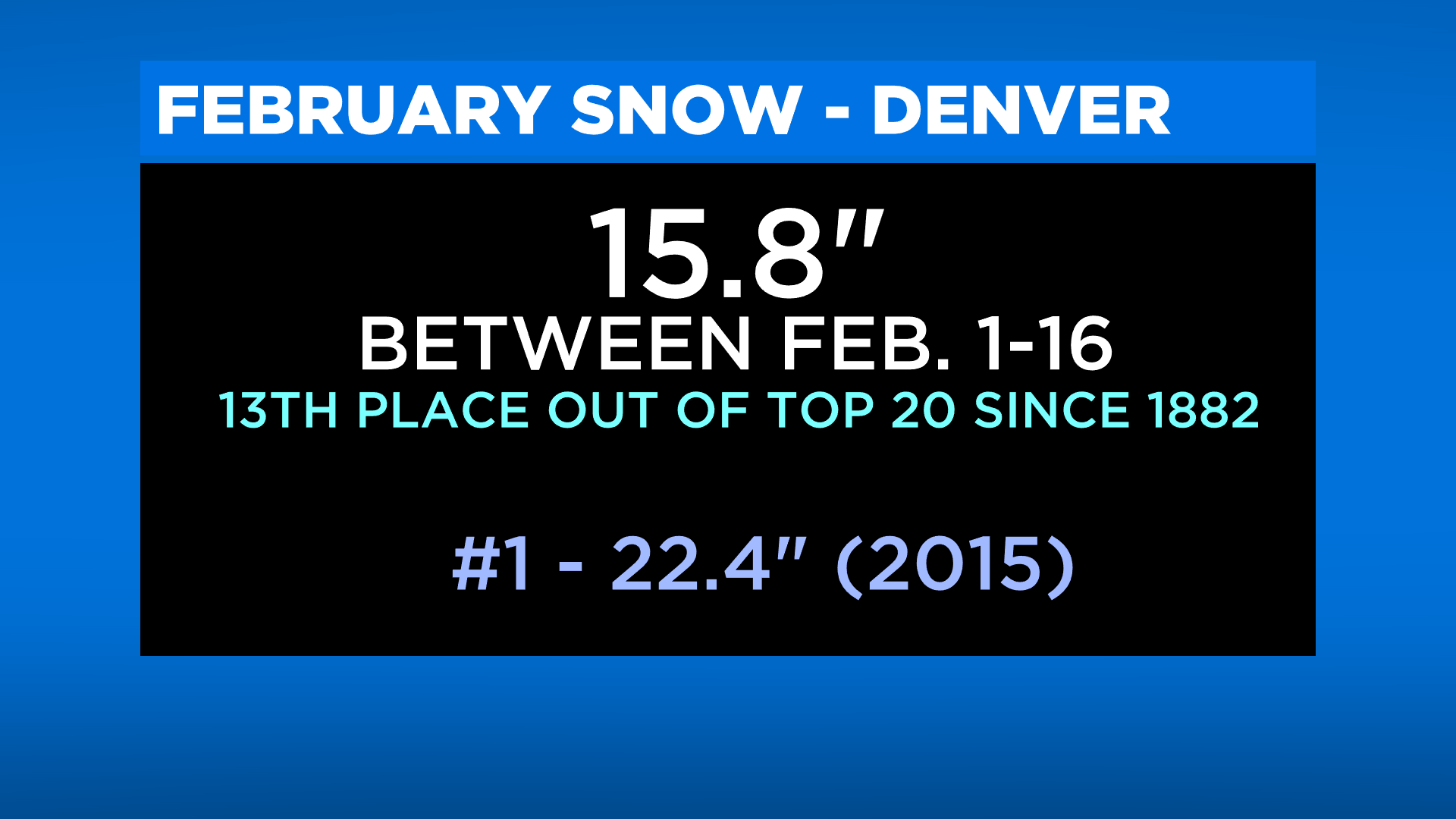 Denver's February snow total through the 16th was 15.8 inches and that ranks in 13th place on the Top 20 List maintained by the National Weather Service in Boulder. That is just 6.6 inches from tying the snowiest February on record when 22.4 inches fell in 2015.