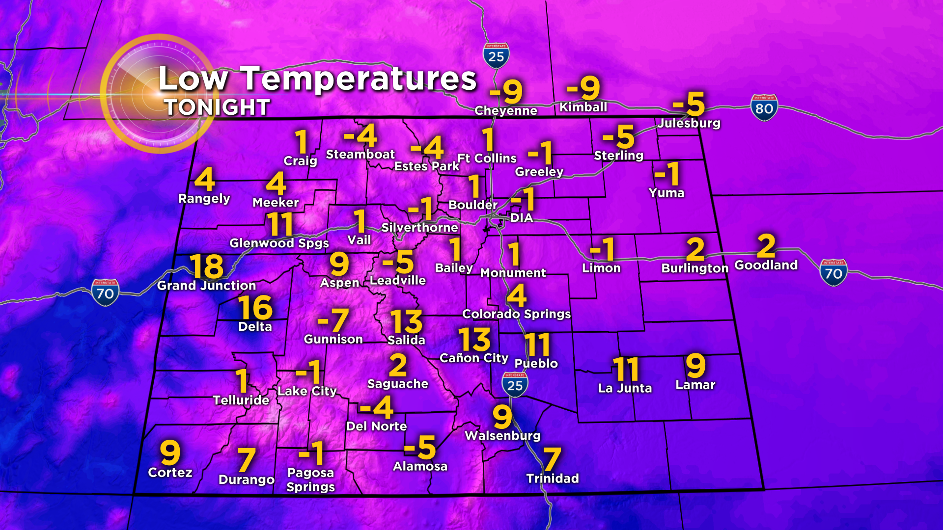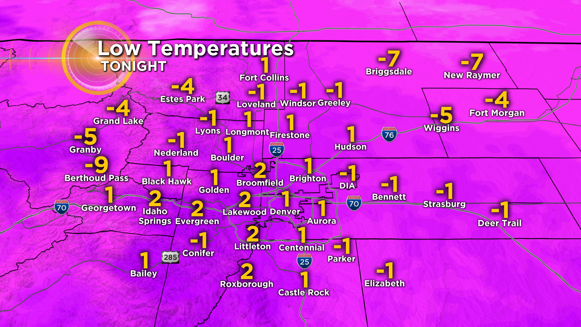 Snow should begin to taper off Wednesday night for most areas of the state. Then, with gradual clearing skies overnight Thursday morning will be cloudy, foggy and very cold! Low temps across the eastern plains will drop into the single digits and below zero! Including Denver and our surrounding suburbs.
