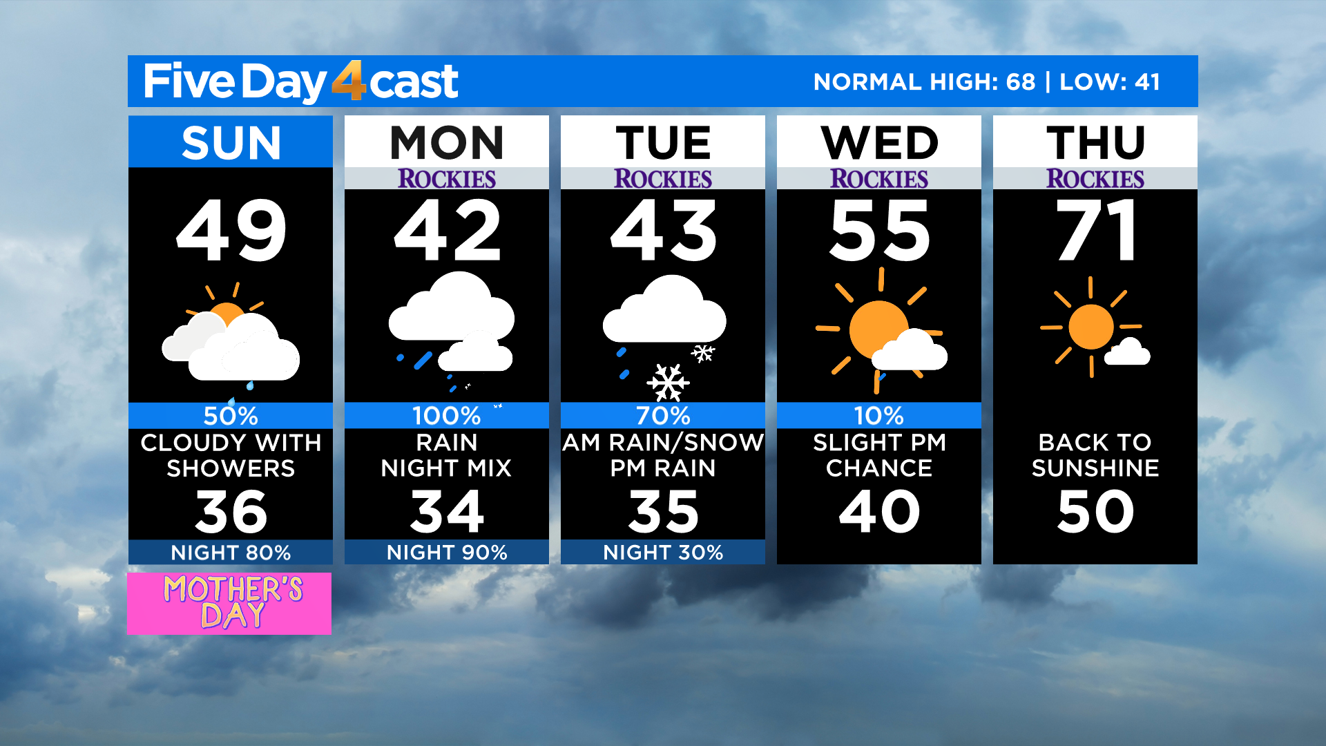 In Denver we're calling for occasional rain with extensive cloud cover for the next three days. Temperatures will be running several degrees below normal for this time of year with daily highs only in the 40s.