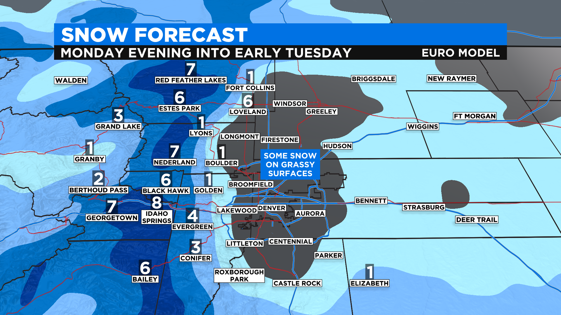 The coldest air associated with this storm system will move into Colorado during the day on Monday with snow levels dropping in the foothills west of Denver by Monday night. There is even potential to see a rain-snow mix or all snow in Denver, along Interstate 25 and on the adjacent plains.