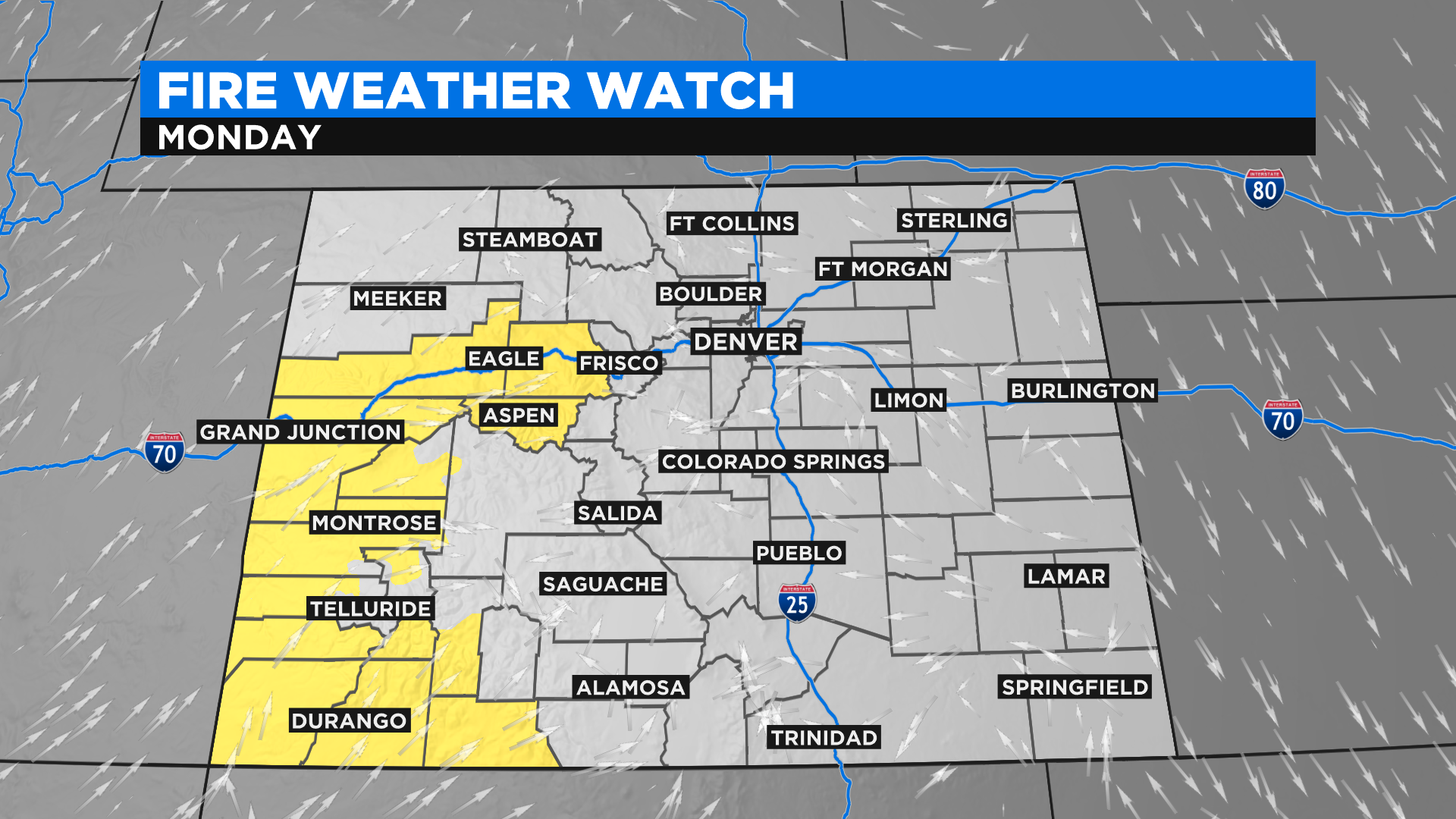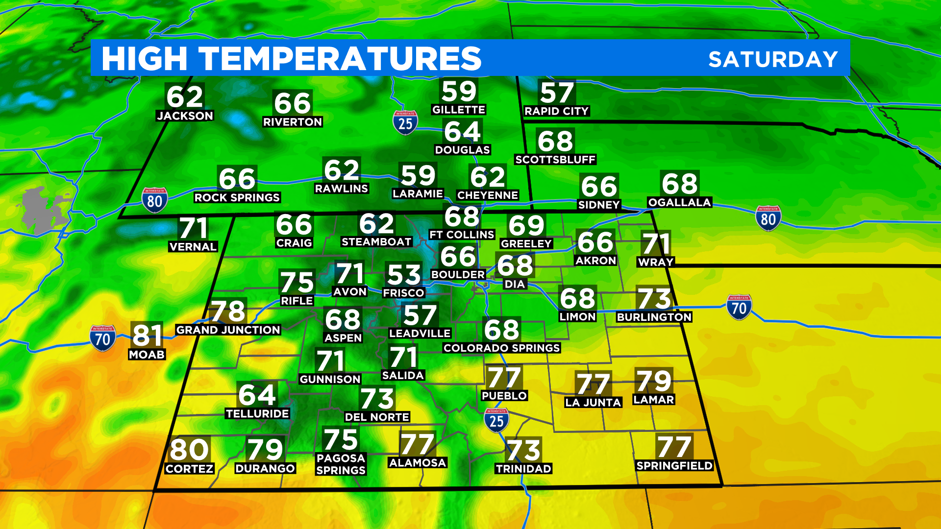 Highs this afternoon should climb into the 70s to near 80 degrees on the western slope with 50s and 60s in the mountains. The northeast plains should top off in the 60s with 70s in the southeast.