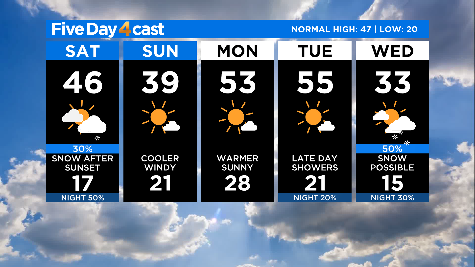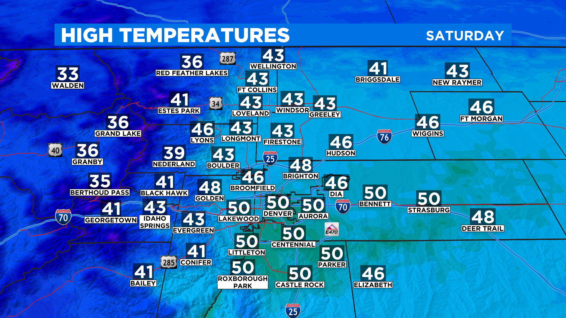 Ahead of the front it will be breezy at times today but our temperatures will be seasonal for this time of year. Most of Denver and the I-25 urban corridor will top out in the 40s this afternoon but a few places could briefly pop up around 50 degrees.