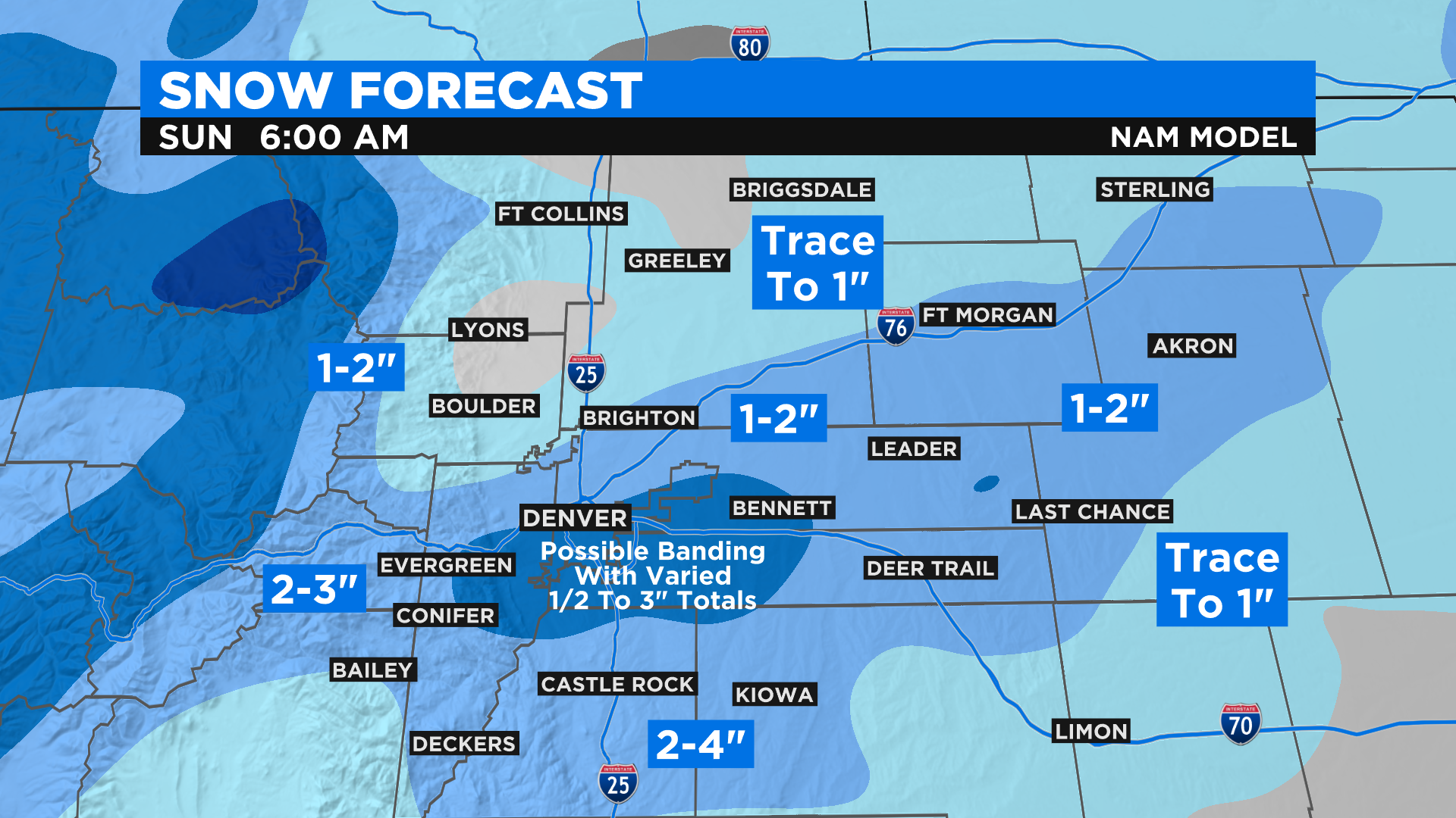 In general the lightest amounts will be north of Denver. Some places like Greeley and Fort Collins could miss out entirely. The highest amounts will be west and south of downtown Denver where some places could see as much as 4 inches of snow. We encourage you to watch CBS4 at 5pm for the latest from Meteorologist Dave Aguilera. He'll be tracking the storm in real-time and will have any necessary updates to this forecast.
