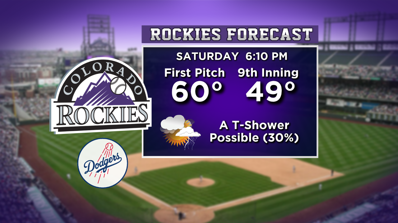 Your Saturday will be partly to mostly cloudy as a weather system moves across the state. We are expecting a few scattered showers and maybe some thunderstorms after 2 p.m. today. If there are any snow showers they will be confined to areas above 10,000 feet in the mountains. For the Rockies game anticipate cloudy skies with temperatures mostly in the 50s. There is a 30% chance for a quick passing shower during the first few innings.