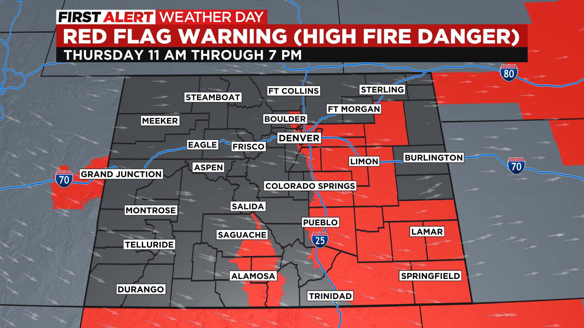 Red Flag Warnings start for the Denver area, parts of the foothills, and eastern plains at 11:00 a.m. Thursday. Gusts could reach 45 mph and we expect humidity to drop as low as 14%.