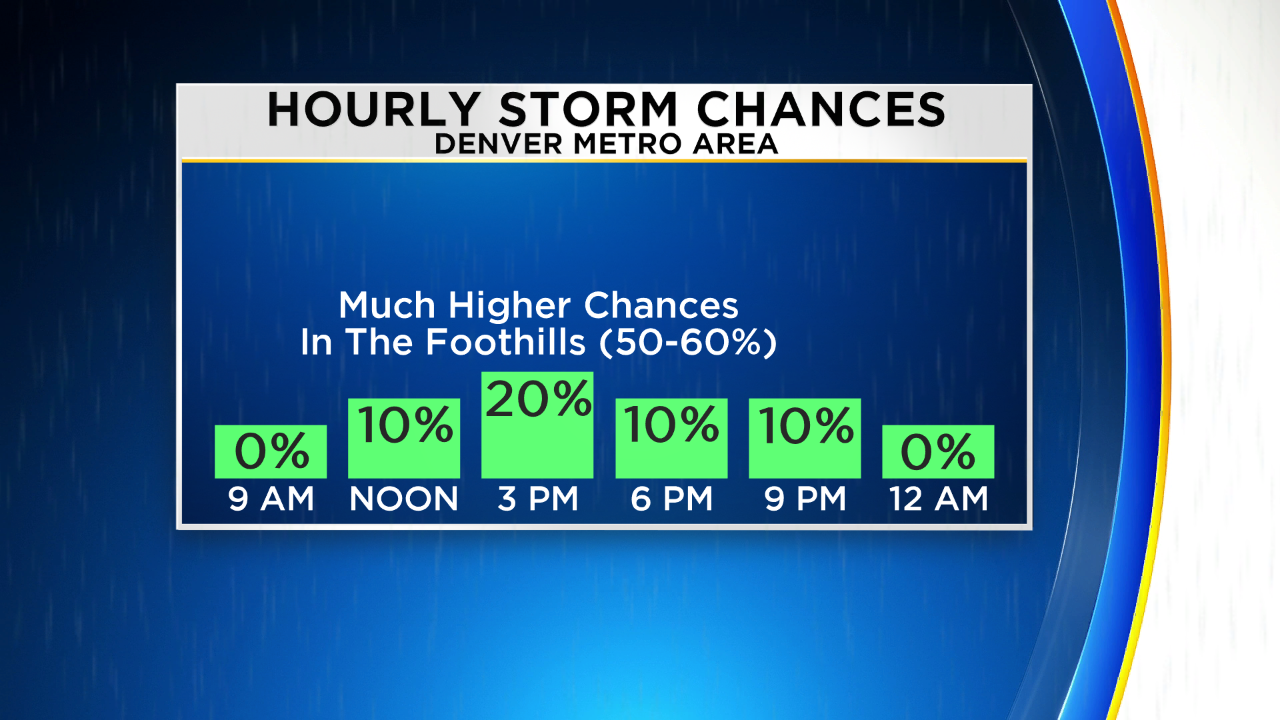 It's a different story in the foothills of Jefferson, Boulder, and Larimer Counties where storm chances will continue to reach at least 50%. These locations above 6,000 feet may also experience more heavy rain.
