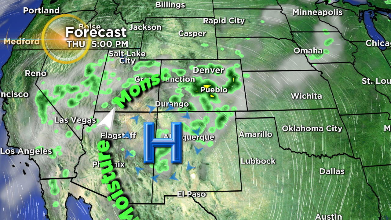 A large ridge of high pressure currently blocking moisture from reaching Colorado will move away on Thursday allowing far more moisture to reach the state. Therefore the chance for afternoon and evening thunderstorms is much higher on Thursday. Most neighborhoods around Denver, Boulder, and Fort Collins should experience at least one or two thunderstorms on Thursday.