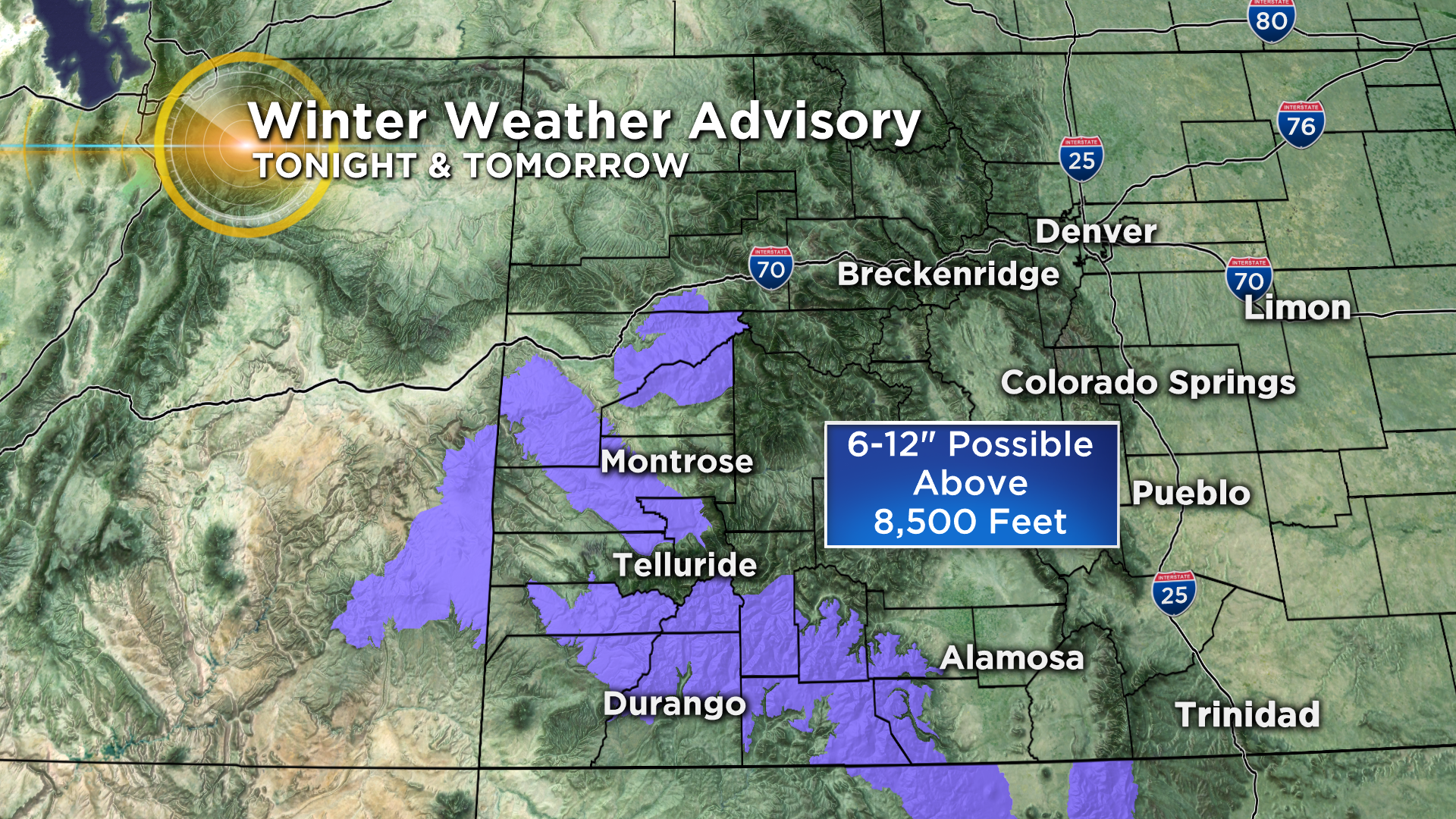 The bulk of the snow will fall in the San Juan Mountains where a Winter Weather Advisory will be in effect tonight and tomorrow. Some places above 8,500 feet could see anywhere from 6 to 12 inches of new snow. Most other mountain locations will see 6 inches or less.