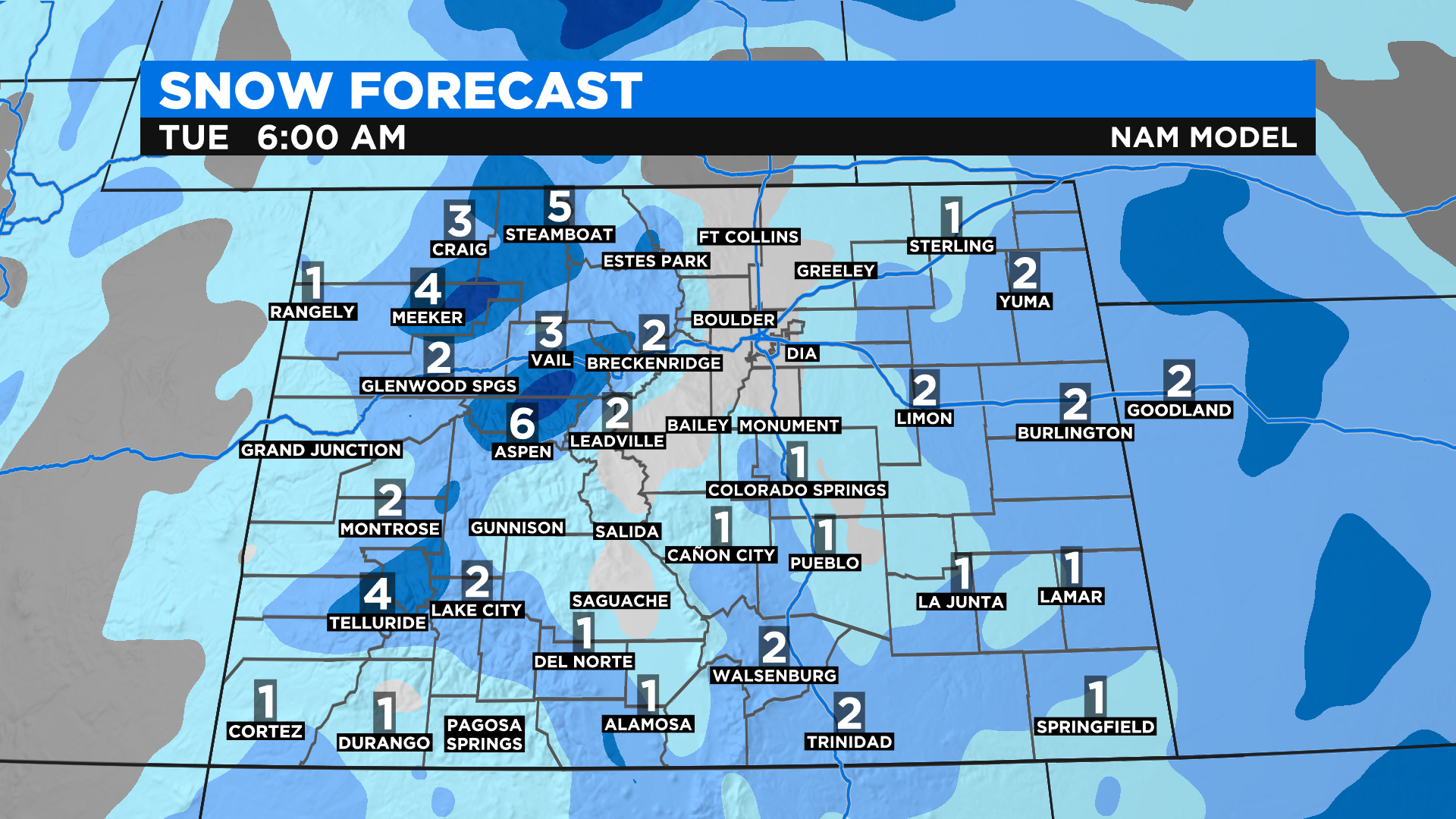 There is a Winter Weather Advisory in the Park and Elkhead Mountains around Steamboat Springs for 4-8 inches of snow. The rest of the mountain locations will see anywhere between 2 and 6 inches on average.