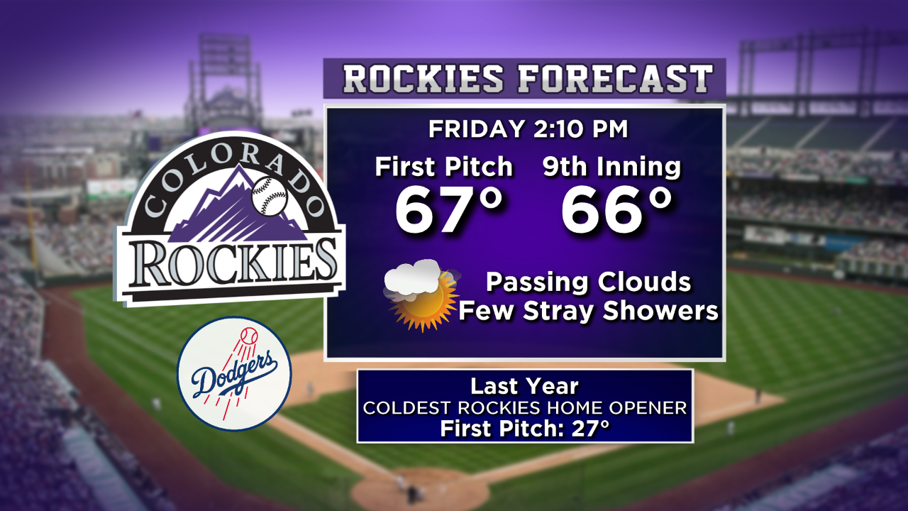 Looking ahead to Friday for the big home opening game for the Rockies the weather will be very comfortable in terms of the temperatures with highs well into the 60s. There is a chance for a few scattered rain showers or isolated thunderstorms.