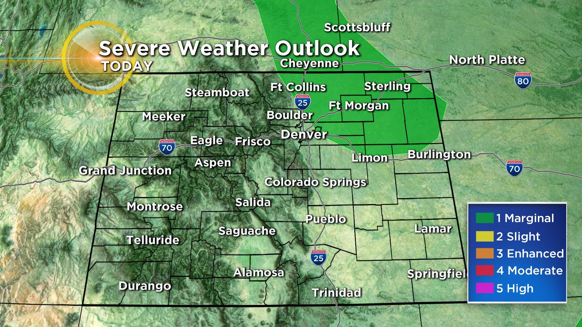 While other areas could see strong storms, including Denver, for the most part they should stay below severe limits. A storm is considered severe if the winds hit 58 mph or greater, hail reaches a diameter of one inch or greater, or if a funnel cloud or tornado is spotted.