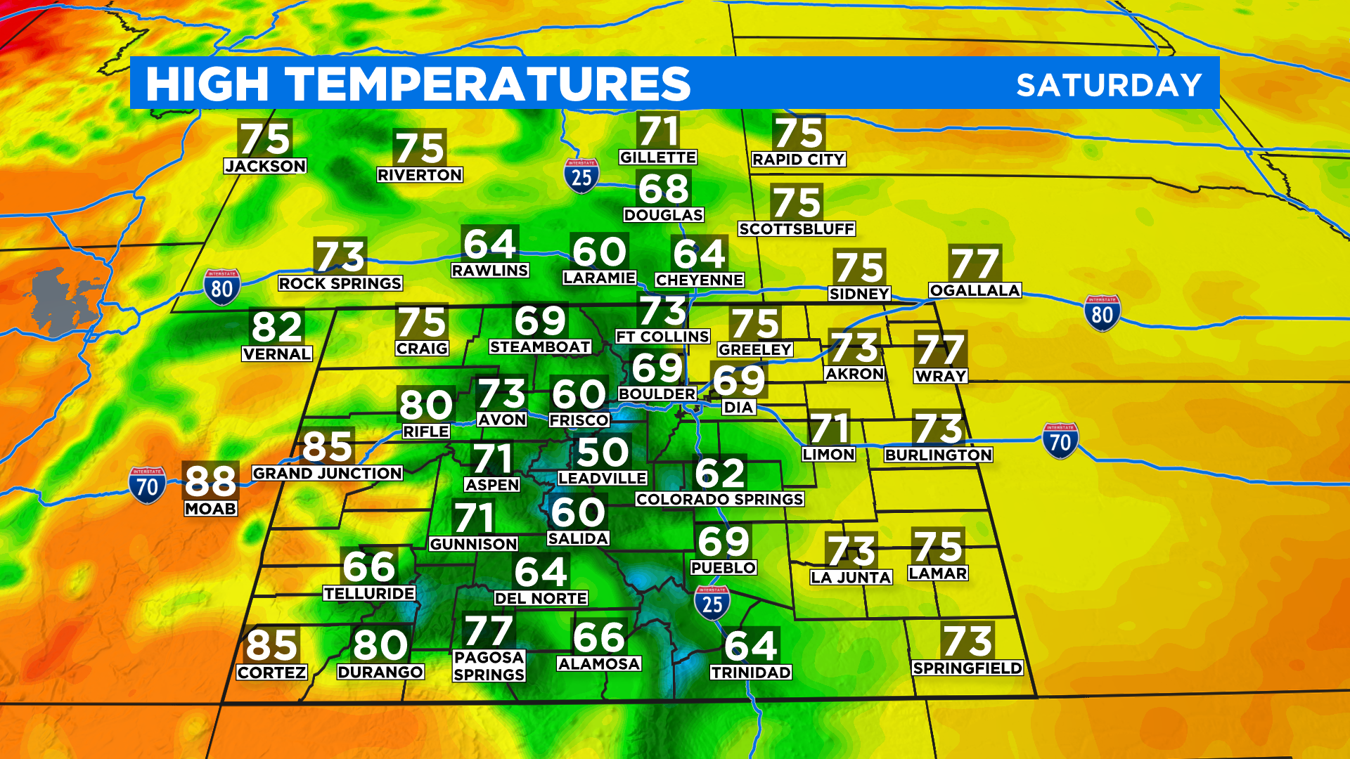 The warmest weather this weekend will be in extreme western Colorado where highs should climb into the 80s. The rest of the state will be in the 60s and 70s but above 10,000 feet it will be colder with highs in the 40s and 50s.
