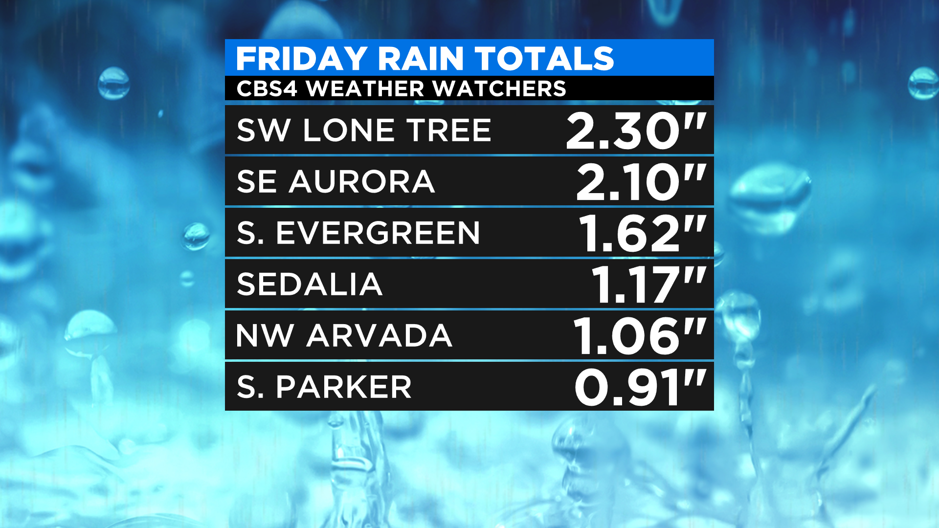 DENVER (CBS4) - Afternoon showers and thunderstorms dropped heavy rain across parts of Colorado on Friday. Some of the highest totals were reported on the south side of metro Denver.