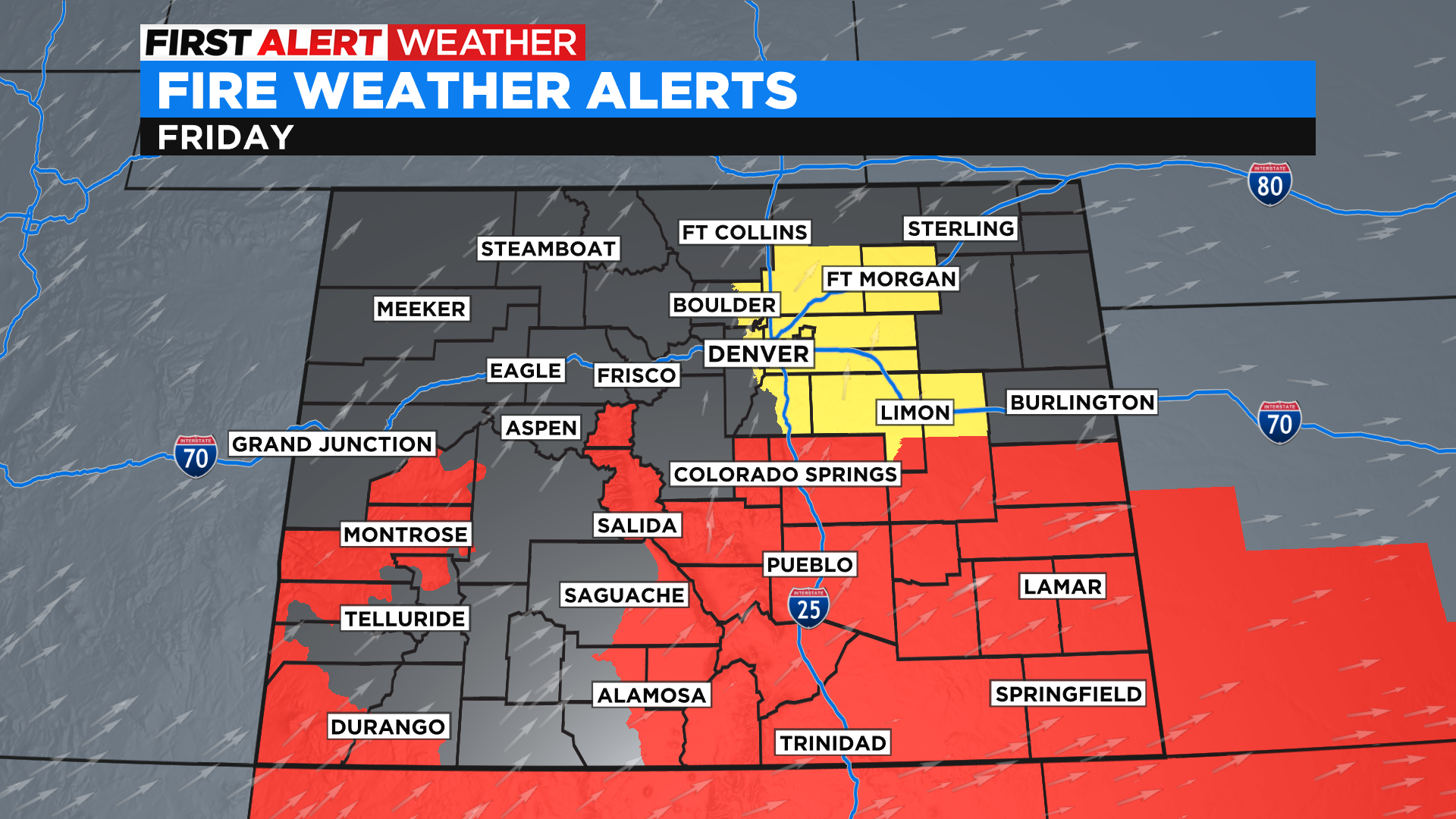 Fire Weather Watches and Red Flag Warnings will be in place for much of southern Colorado and the Denver area on Friday. Expect strong wind up to 50 mph to go with our parched conditions.