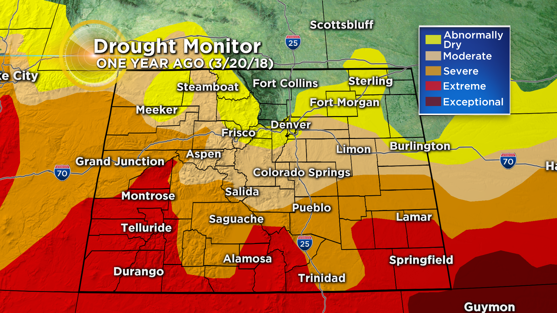 A year ago, in late March 2018, about 75 percent of Colorado was under some stage of drought and more than 90% of the state was considering "abnormally dry" which is the precursor to drought.