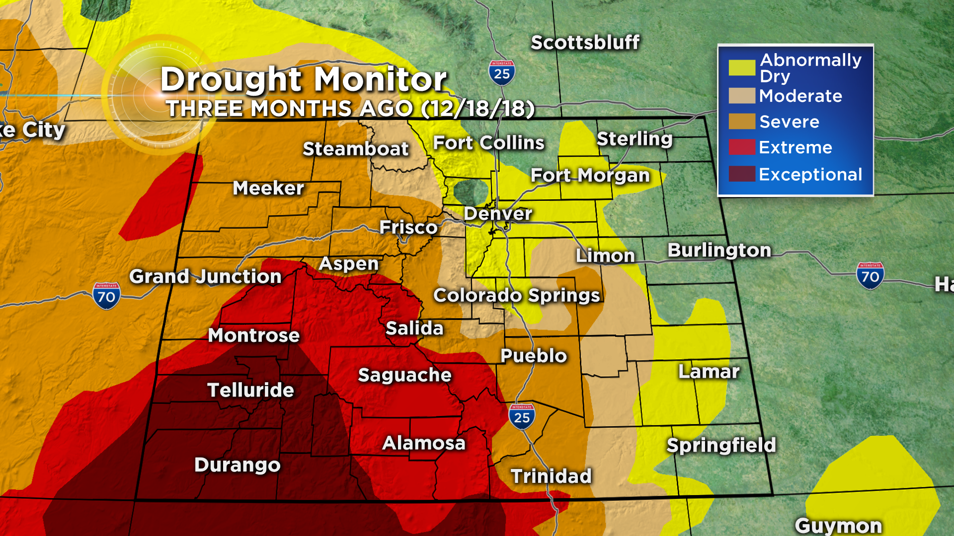 By December 2018 the drought situation had grown even worse for the southwest region of Colorado with the worst drought category (exceptional drought) developing in the San Juan Mountains and surrounding areas including Durango, Pagosa Springs, and Cortez. Meanwhile along the Front Range abnormally dry conditions had developed for virtually the entire Denver metro area. 66% of Colorado was under some stage of drought at the end of 2018.