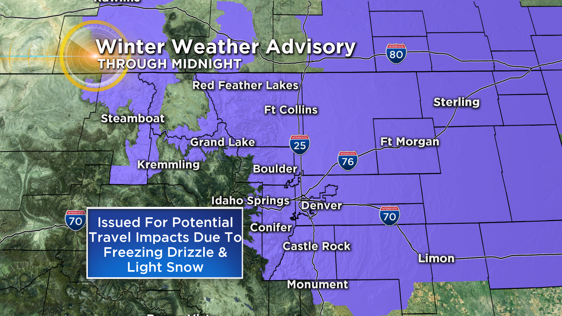 Because of the threat of icy travel due to the wintry mix of precipitation and falling temperatures, the National Weather Service has issued a winter weather advisory for a large part of northern and northeast Colorado until midnight.