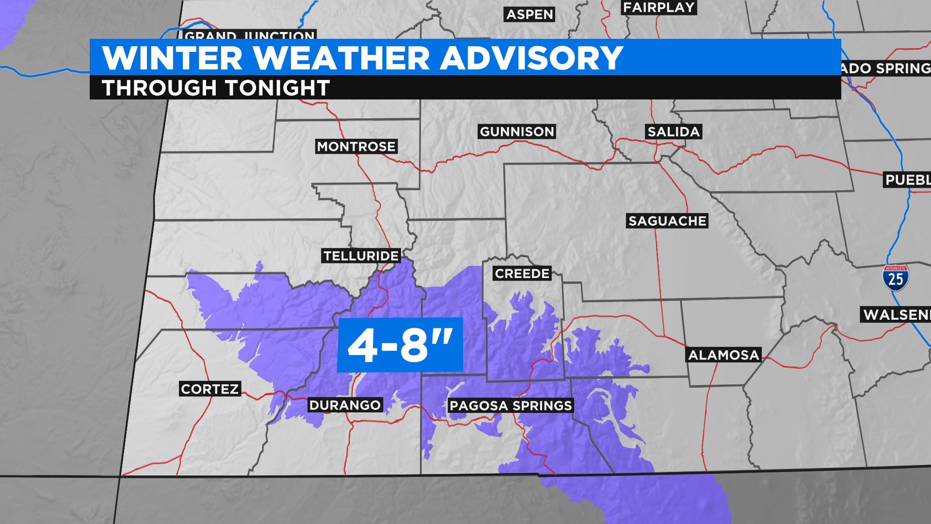 The highest totals should end up coming from the San Juan Mountains where the National Weather Service has issued a Winter Weather Advisory through Saturday morning for the potential to see some tough winter travel.