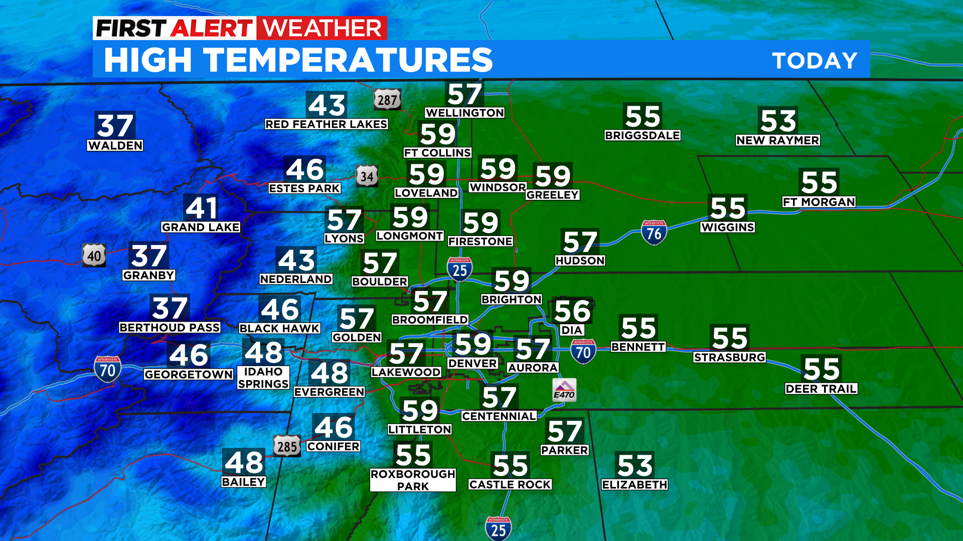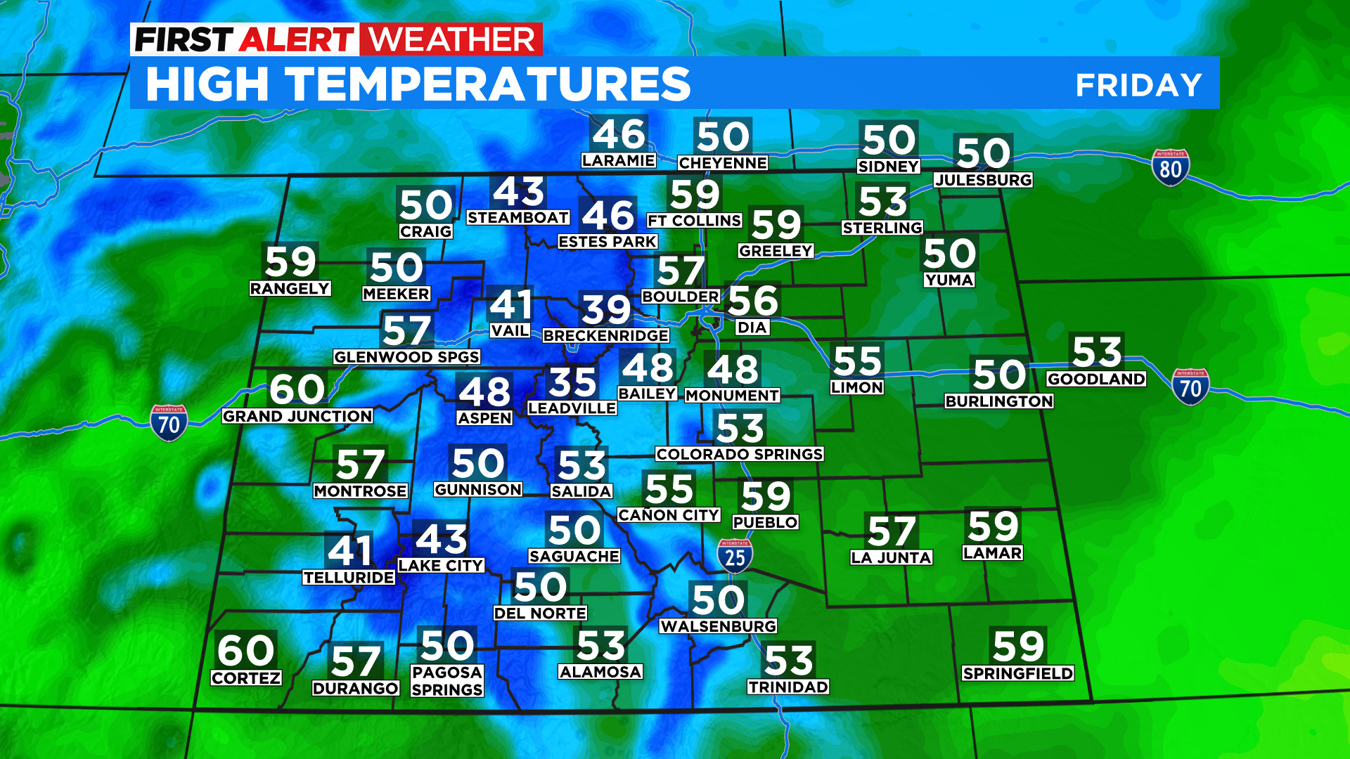 Saturday will be the pick day of the weekend with plenty of sunshine around the state and mild temperatures. In Denver and on the eastern plains we expect highs to climb into the upper 60s and lower 70s. We'll see 40s and 50s in the mountains with 60s and 70s on the western slope.