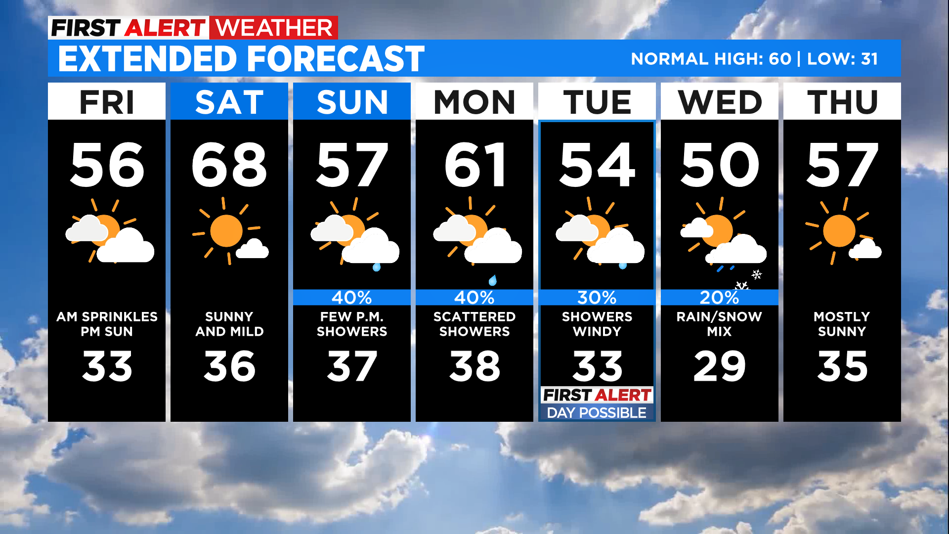 Things will turn a bit unsettled again on Sunday as a new storm moves into the region. Clouds will increase throughout the day and we'll eventually see some rain and snow showers develop. The unsettled weather will stick around through Wednesday as a few different storm systems cross the region. In addition to some showers we could see strong and gusty wind develop in eastern Colorado during the day on Tuesday.