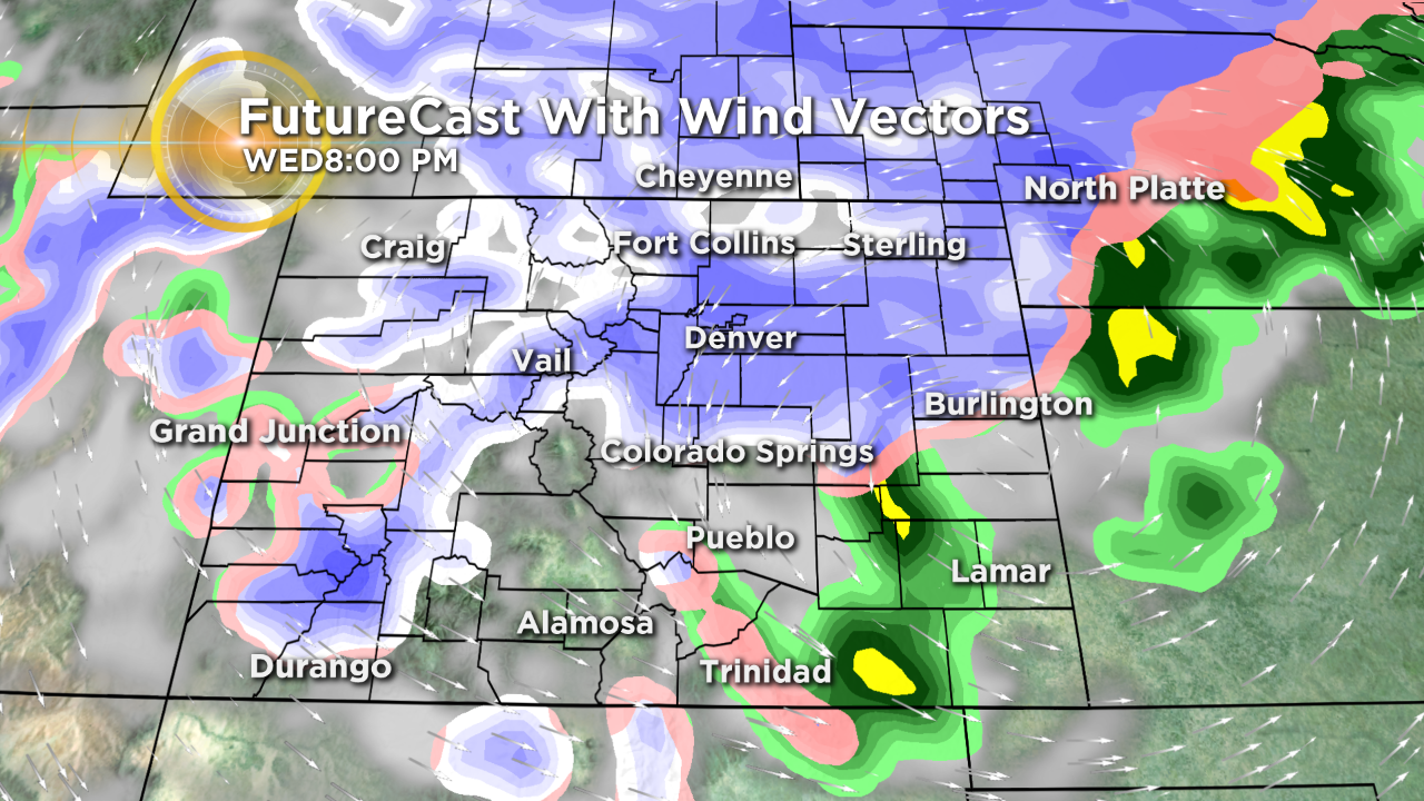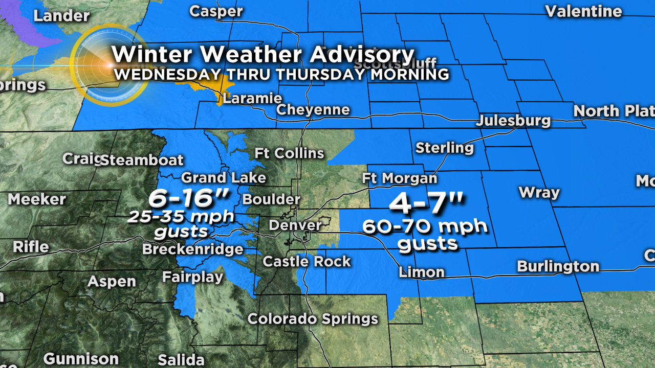 The Winter Storm Watches are for a big blast of wind and snow for Wednesday through Thursday morning. The eastern plains from Castle Rock north and east into Nebraska and Kansas have the potential for 4 to 7 inches of snow and wind gusts up to 70 mph!