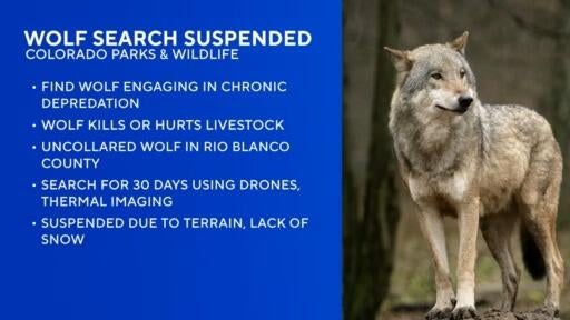After 30 days of searching, CPW has called off efforts to locate an uncollared wolf engaged in chronic depredation due to difficult terrain and lack of snow.