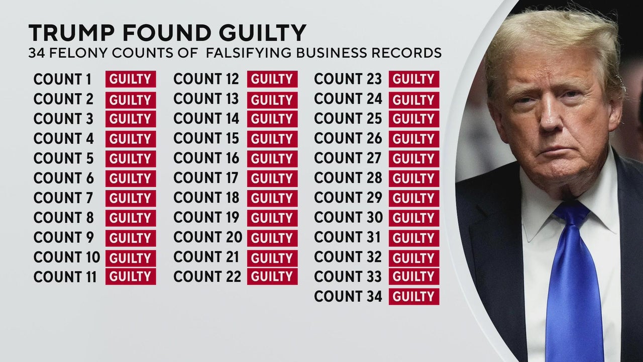 Former President Donald Trump was found guilty of 34 felonies by the jury in his "hush money" trial in New York on Thursday, a momentous decision that makes him the first former president in U.S. history to be convicted of a crime.