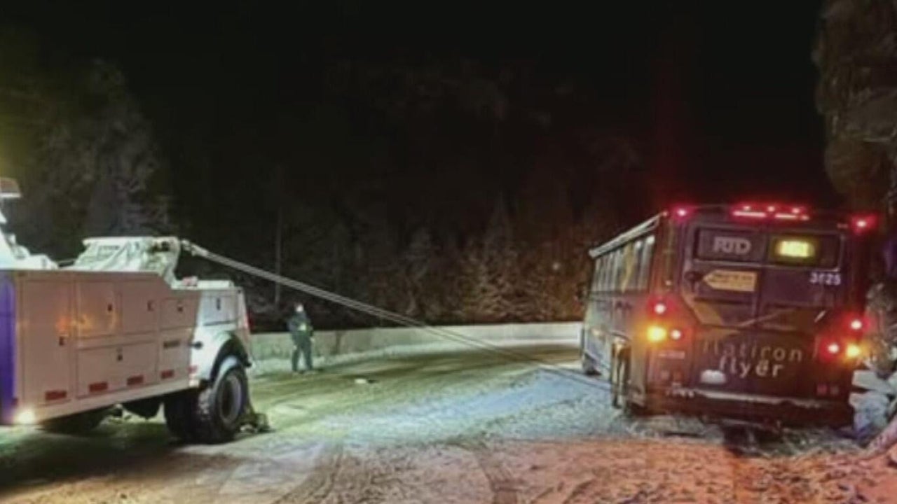 An RTD bus slid off the road in Boulder County on Sunday night as the snow continued to fall.