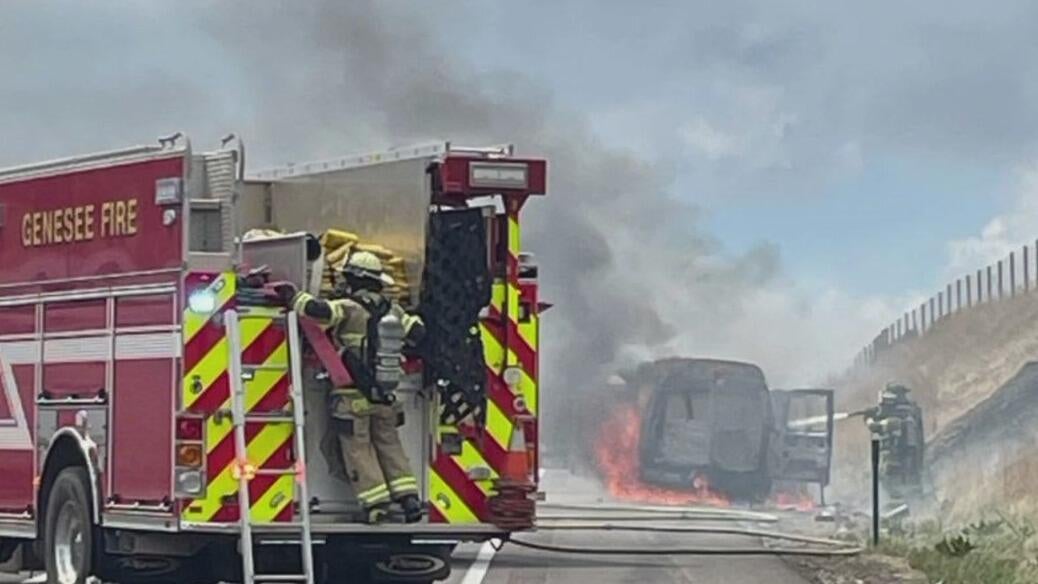 Flames shot from a van parked on the side of the westbound lanes of I-70 between Lookout Mountain and Genesee on Tuesday afternoon.