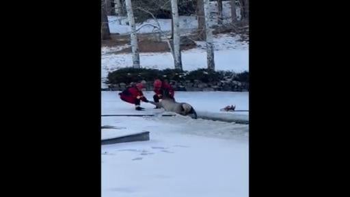 Video shows 2 firefighters rescue a large elk from icy pond