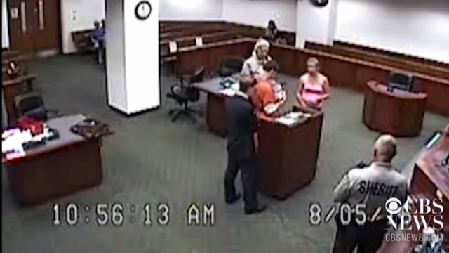 Emotional courtroom video shows a burglary suspect meeting the child for the first time as a Kentucky judge looks on from the bench