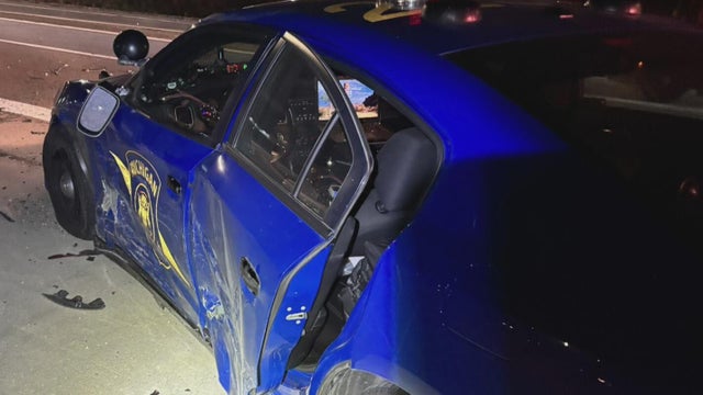 A Michigan State Police trooper was injured early Monday morning after a suspected intoxicated driver crashed into a patrol car, police said.