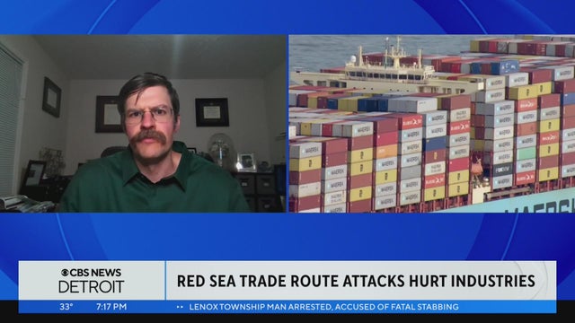 The Israel-Hamas war has had a widespread effect on global trading, particularly in the Red Sea, as commercial ships have been attacked. Jason Miller, professor in supply chain management at Michigan State University, joins CBS News Detroit to discuss the disruptions in the Red Sea.