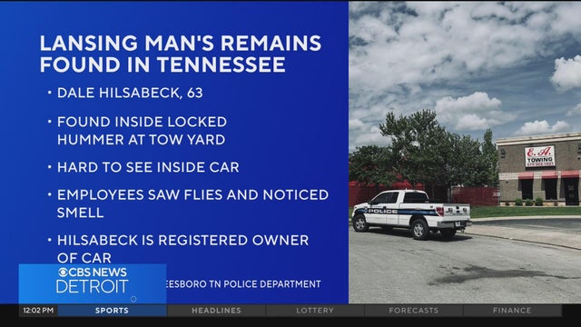 Dale Hilsabeck, 63, of Lansing, was inside his 2007 Hummer H3, which had been towed from a local Walmart to the E.A. Towing lot in Murfreesboro, Tenn. Detectives are awaiting the results of an autopsy to determine the cause of his death, according to a report from Murfreesboro police.