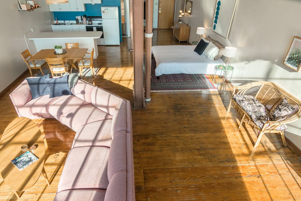 Industrial studio loft in Corktown close to downtown, Cobo Center, coffee shops, bars, restaurants, the Detroit River, shopping, and accessible to everything else amazing in Detroit. Perfect spot for a weekend getaway or a romantic retreat. Click here for more info.