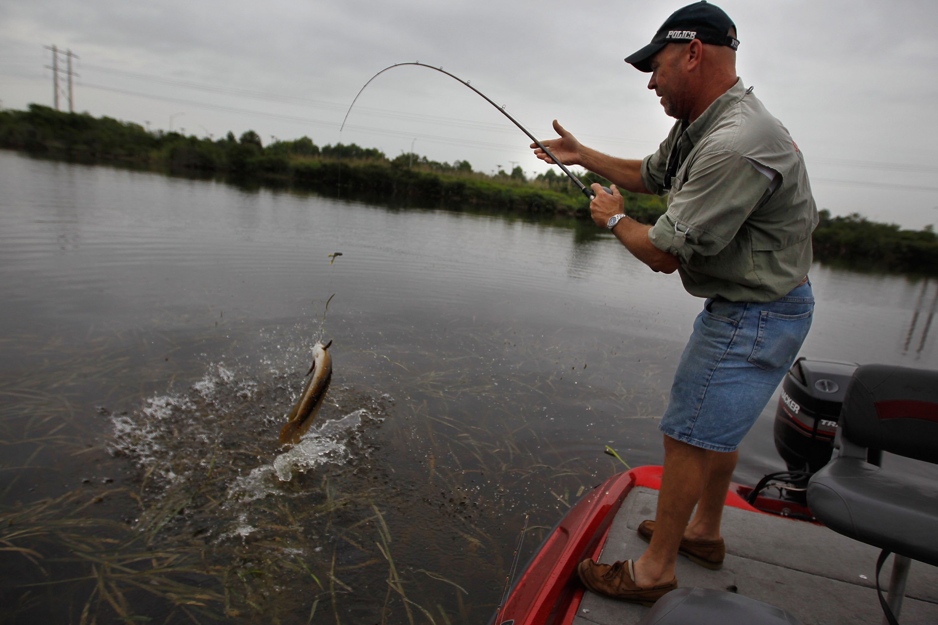 WESTON, FL - MAY 16: Jason Calvert, from JD's Custom Baits, reels in a snakehead fish that he caught while fishing in a canal on May 16, 2012 in Weston, Florida. The invasive snakehead fish is known for its aggressiveness and they're eating anything from bass to turtles and an occasional duckling. It is unknown exactly how the species, that is native to parts of Asia, was introduced to the South Florida area but it concerns people because the presence of an exotic species can alter the ecosystem to the detriment of native species. A healthy number of fisherman now go after the fish which helps control the species and puts what many fisherman say is a tasty fish on their plate. (Photo by Joe Raedle/Getty Images)