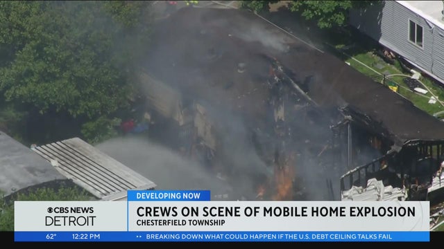 Crews are battling a fire after a mobile home exploded in Chesterfield Township Friday.