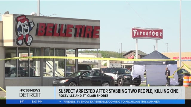 A suspect in a fatal stabbing at a Belle Tire on Gratiot Avenue is in custody.