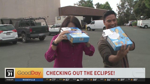 Jordan and Tina try their cereal box eclipse viewers live right outside Good Day HQ!