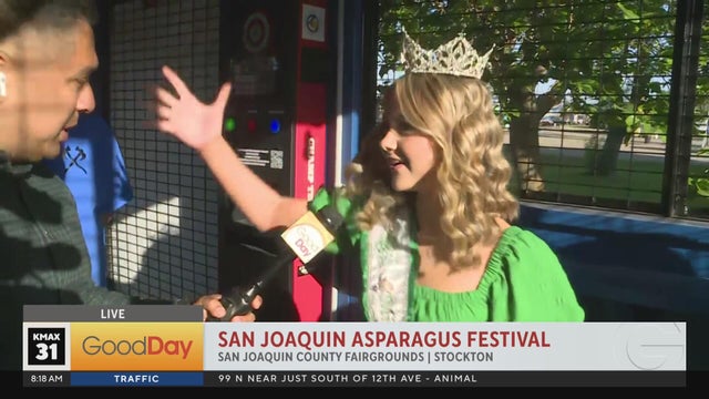 Festival spokesperson, Alan Sanchez, goes head to head with Asparagus royalty in an axe throwing competition at the San Joaquin Asparagus Festival in Stockton at the San Joaquin County Fairgrounds.