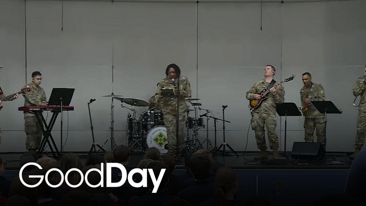 The Army's 4th Infantry Division Band, based at Fort Carson, Colorado, performs live for students at John Adams Academy in Roseville.